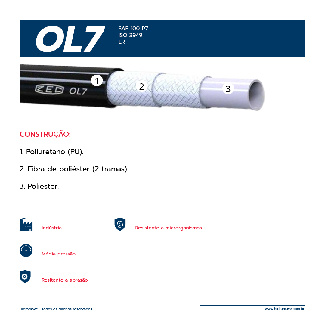 A OL7 é uma mangueira termoplástica leve e flexível, projetada para sistemas hidráulicos de média pressão e aplicações industriais diversas. Sua construção moderna proporciona excelente resistência à abrasão, ozônio e a microrganismos, tornando-a ideal para ambientes de operação contínua e exposição externa.